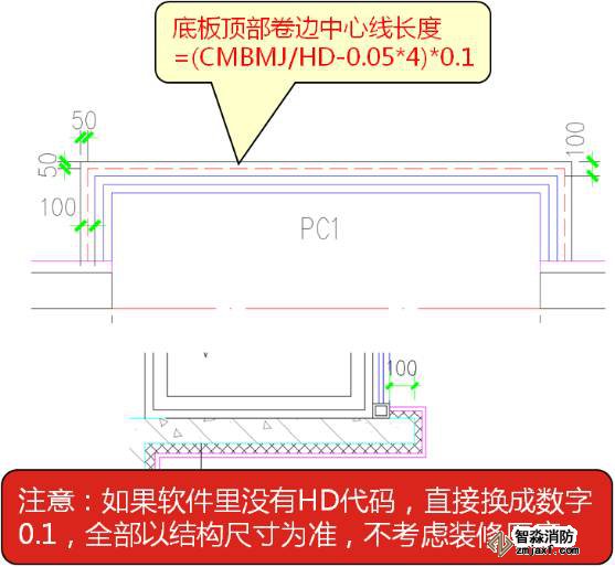 估計很多朋友看不懂“(CMBMJ/HD-0.05*4)*0.1”,我解釋下,CMBMJ是飄窗底板側面模板面積,除以HD(厚度)就是側面長度,減去0.05*4就是我們要求底板裝修上翻的中心線長度,在乘以0.1就是上翻的面積。