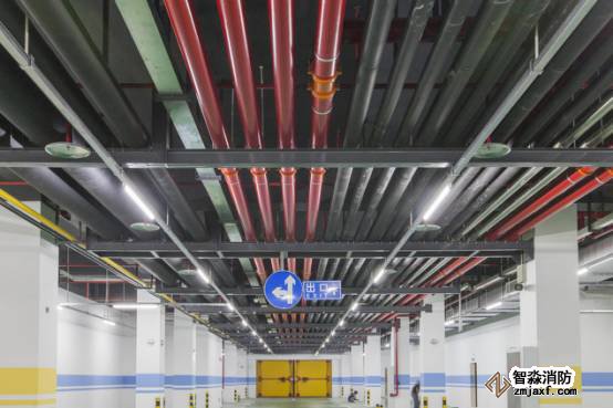 車庫管線排布美觀,聯(lián)合支吊架安全可靠,管道居套管中,燈帶線槽平直,噴淋布置間距一致,標識清晰。