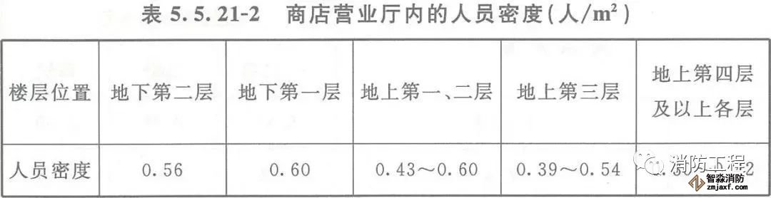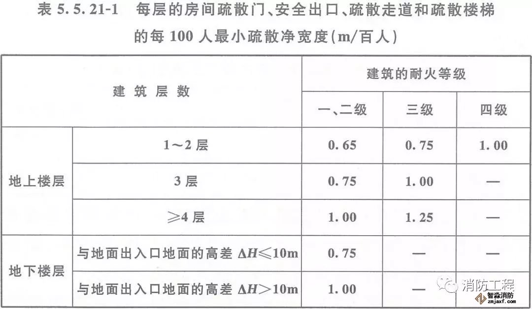 每層的房間疏散門、安全出口、疏散走道和疏散樓梯的各自總凈寬度,應根據疏散人數按每100人的最小疏散凈寬度不小于表5.5.21-1的規定計算確定。