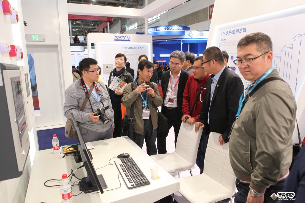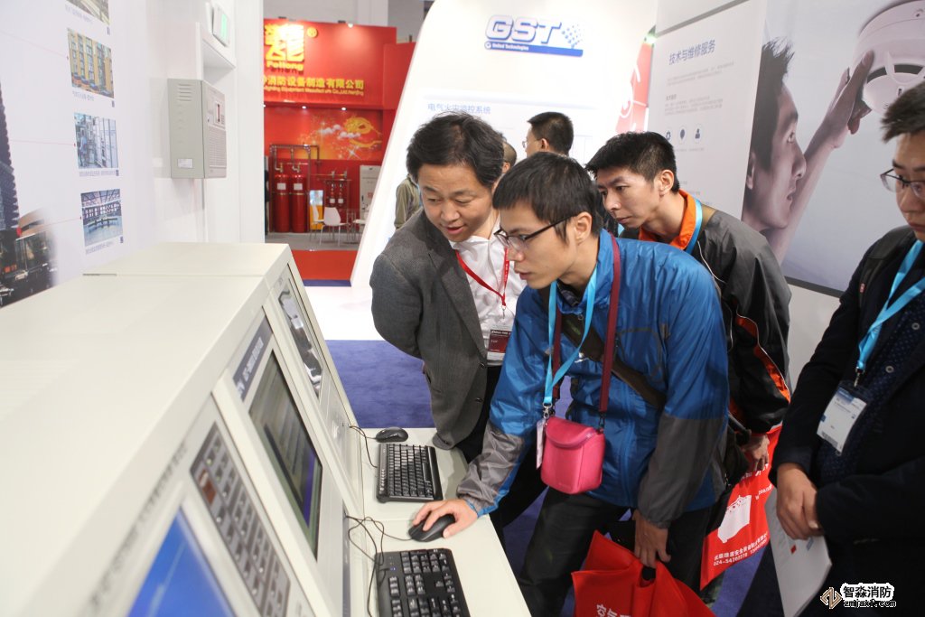 參觀者向技術(shù)人員了解海灣消防遠(yuǎn)程監(jiān)控管理系統(tǒng)