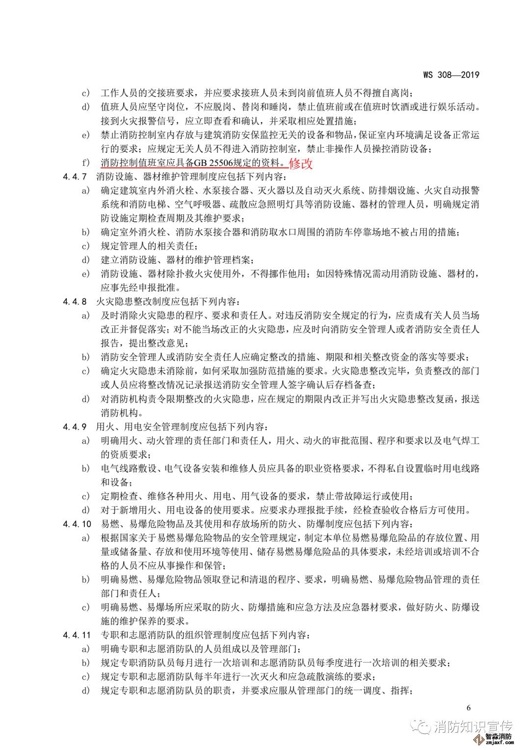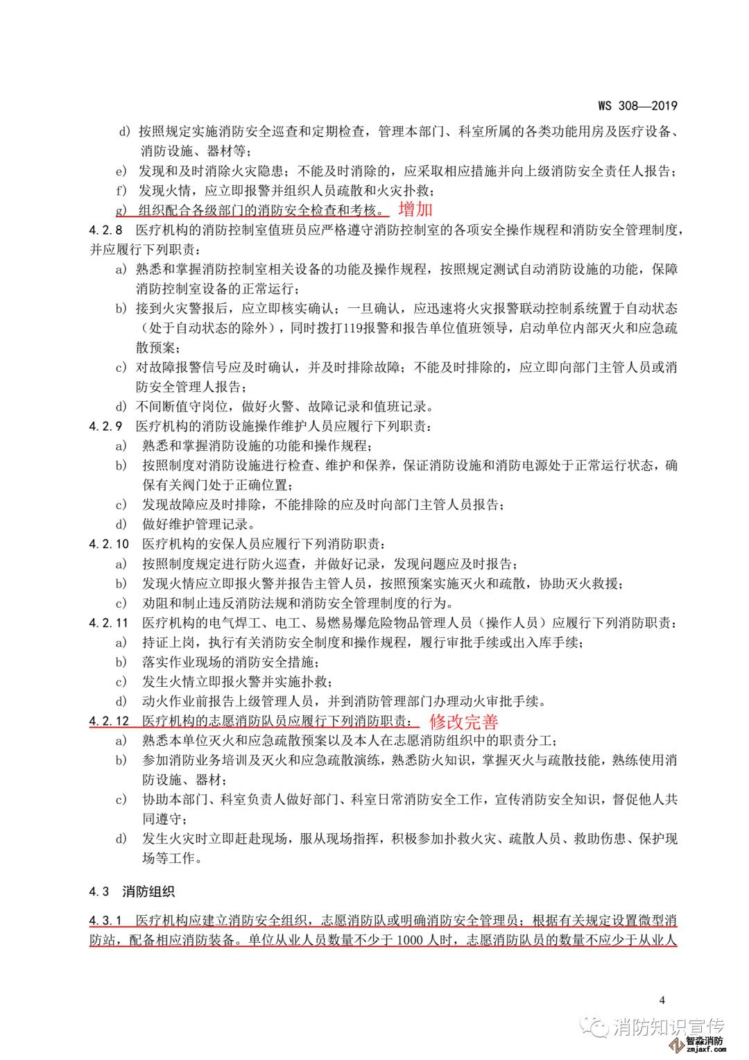 ——修改了各部門、科室的消防安全責任人的職責要求(見4.2.7, 2009年版的4.2.6);