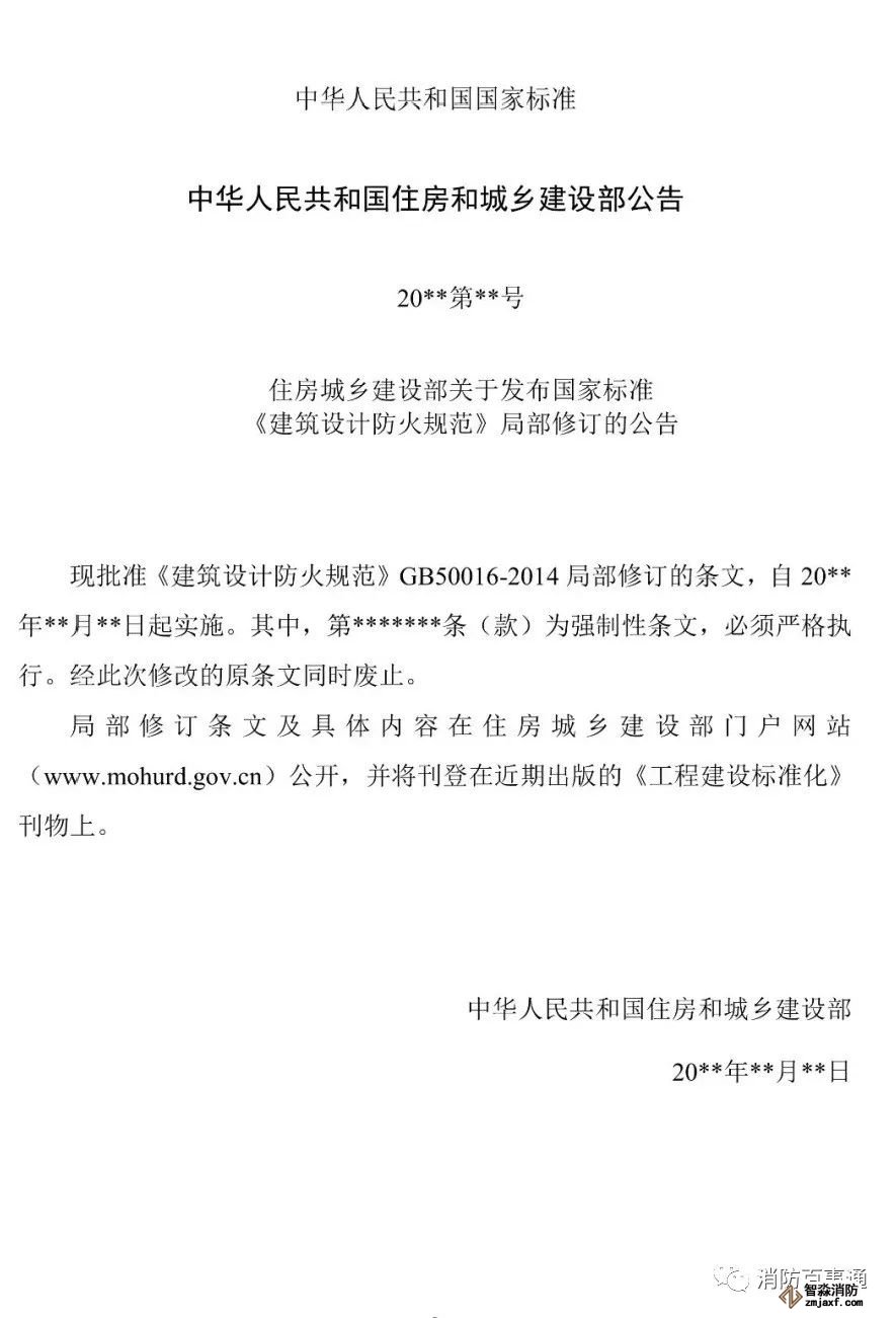 現批準《建筑設計防火規范》GB 50016-2014局部修訂的條文,自20**年**月**日起實施。其中,第*******條(款)為強制性條文,必須嚴格執行。經此次修改的條文同時廢止。