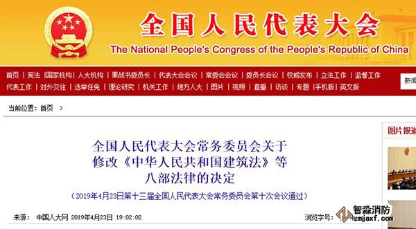 4月23日,新《消防法》由全國人民代表大會常務委員會第十次會議通過,并公布實施。主要新在稱謂(消防救援機構取代了公安機關消防機構,國家綜合性消防救援隊取代了公安消防隊)、職能和住建承擔工程審驗。