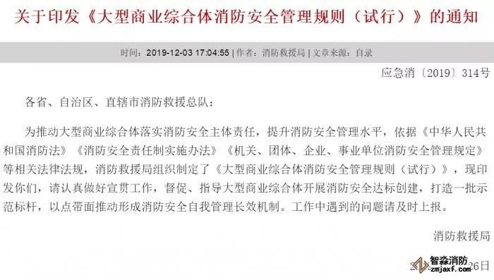 12月3日,應急管理部消防救援局印發《大型商業綜合體消防安全管理規則(試行)》的通知。第十二條明確:消防安全管理人對消防安全責任人負責,應當具備與其職責相適應的消防安全知識和管理能力,取得注冊消防工程師執業資格或者工程類中級以上專業技術職稱。