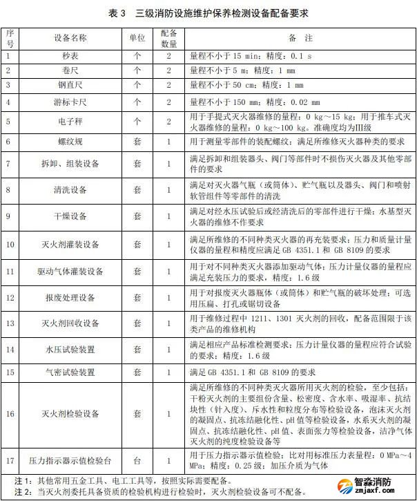 三級消防設施維護保養檢測設備用于滅火器的檢查、維修、更換滅火劑及回收,其設備配備的種類和數量至少應滿足下表3的要求。