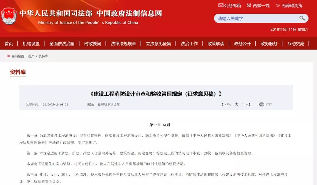 2019年5月10日,中國政府法制信息網(wǎng)發(fā)布:住房和城鄉(xiāng)建設部關(guān)于《建設工程消防設計審查和驗收管理規(guī)定(征求意見稿)》公開征求意見的通知。