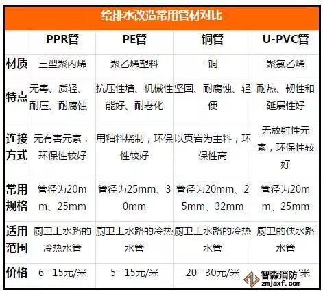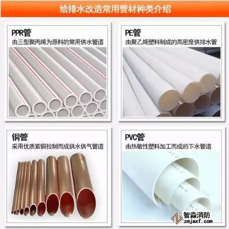 給排水改造的管材包括:PPR管、PE管、銅管、U-PVC管、鍍塑管、不銹鋼管、鍍鋅管等。一般,上水改造通常會使用環保的PPR管,鍍鋅管和銅管也屬主流管材。而下水改造的材料一般選用有阻燃效果的U-PVC管。