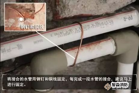 鋪設好一段管道后,須使用鋼釘和銅線對管道進行固定。以免鋪設好的管道位置移位,造成不必要的麻煩。