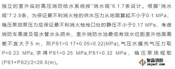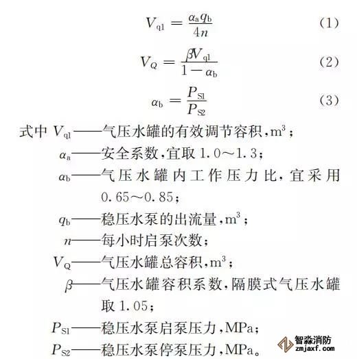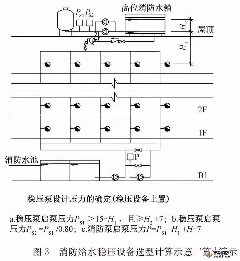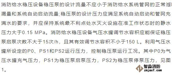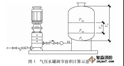 臨時高壓消防給水系統(tǒng)一般均應(yīng)設(shè)置高位消防水箱(除符合規(guī)范規(guī)定可不設(shè)的情形外),且對其設(shè)置高度有一定要求。日本規(guī)范規(guī)定自動噴水滅火系統(tǒng)屋頂消防水箱最不利的最低供水壓力為0.15 MPa,美國、英國規(guī)范則要求0.10 MPa。我國1987年版和2006年版“建規(guī)”對比均沒有規(guī)定,只在條文中要求重力自流的消防水箱應(yīng)設(shè)置在建筑的最高部位。1982年版《高層民用建筑設(shè)計規(guī)范》(以下簡稱“高規(guī)”)首次提出屋頂消防水箱應(yīng)滿足最不利消火栓的靜水壓力,但沒有提出設(shè)計參數(shù),1995年版“高規(guī)”做了具體規(guī)定。國標圖集98S205編制目的是為解決臨時高壓消防給水系統(tǒng)高位消防水箱設(shè)置高度滿足不了系統(tǒng)最不利點靜水壓力時應(yīng)設(shè)增壓設(shè)施的要求,其為消防專用的增壓穩(wěn)壓設(shè)備的主要功能只是火災(zāi)初期時、消防主泵啟動前,確保具有足夠消防壓力的30 s儲水量進行初期火災(zāi)撲救,直至消防主泵全負荷啟動運行。這里更多的還是強調(diào)增壓的概念,設(shè)備類似于氣壓供水,發(fā)揮主要作用的是氣壓水罐,穩(wěn)壓水泵的作用是在3 min內(nèi),補足氣壓水罐內(nèi)實際穩(wěn)壓水容積。利用氣壓水罐所設(shè)定的P1、P2、PS1和PS2運行壓力來控制穩(wěn)壓泵運行工況。P1為根據(jù)計算求得消火栓系統(tǒng)或自動噴水滅火系統(tǒng)中最不利點所需的消防壓力作為氣壓水罐的充氣壓力。平時管道系統(tǒng)如有滲漏泄壓等情況,控制穩(wěn)壓水泵不斷補水穩(wěn)壓,在PS1、PS2(啟動-停止)反復運行,一旦有火情,管道系統(tǒng)大量缺水,造成PS1下降(PS1→P2),降至P2時,立即啟動消防主泵。