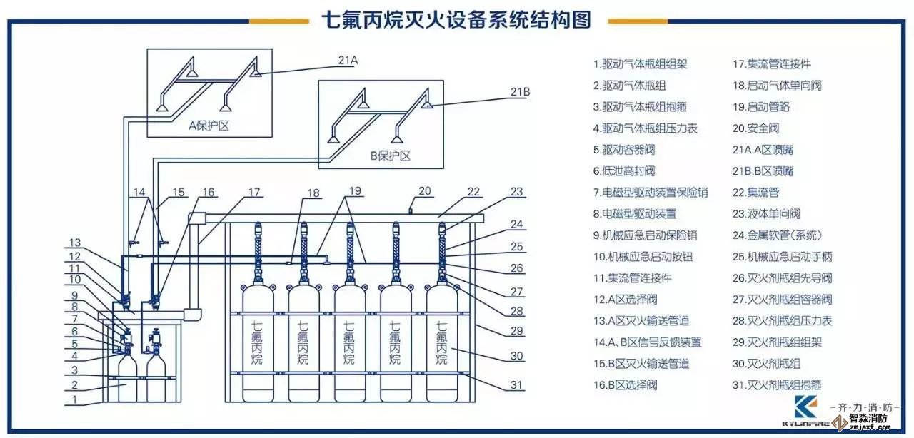 七氟丙烷滅火設備需要設置專用的設備間,用一套或一套以上的貯存裝置保護一個或一個以上的保護區(總保護區數量≤8個,總保護區體積≤3600m³),使用管網將滅火劑輸送到保護區的系統。